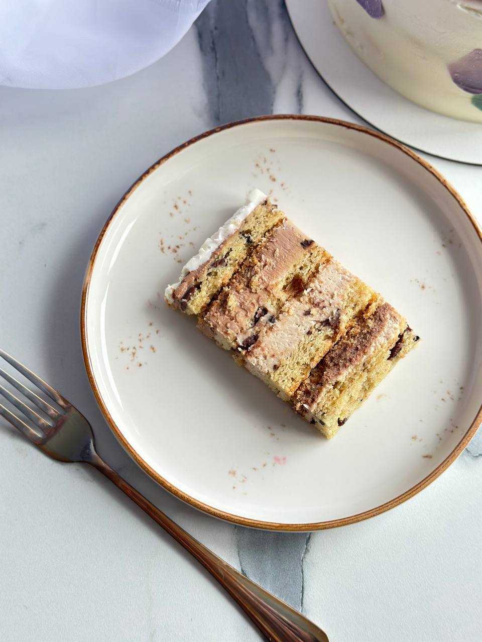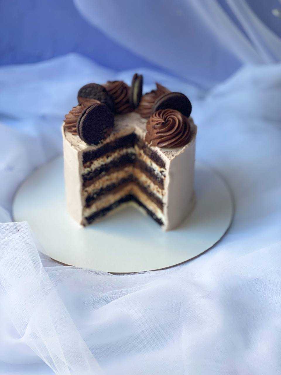 Коржи из Американского печенья с кусочками шоколада, сливочный крем с добавлением ореховой пасты, шоколадный крем, печенье или арахис на выбор