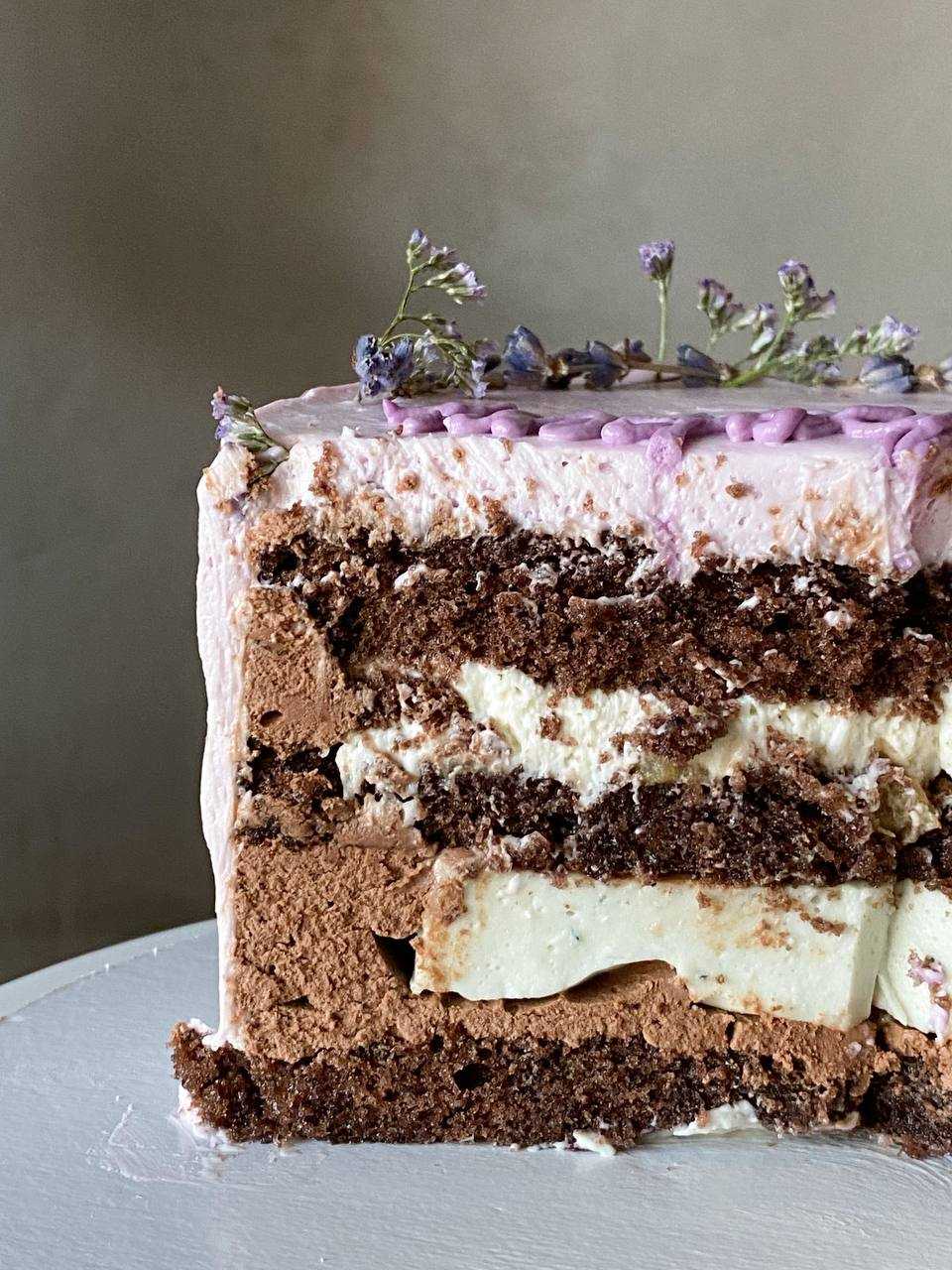 Насыщенные шоколадные коржи или ванильные коржи на выбор, шоколадный крем, сливочный крем-чиз и хрустящие шарики криспи