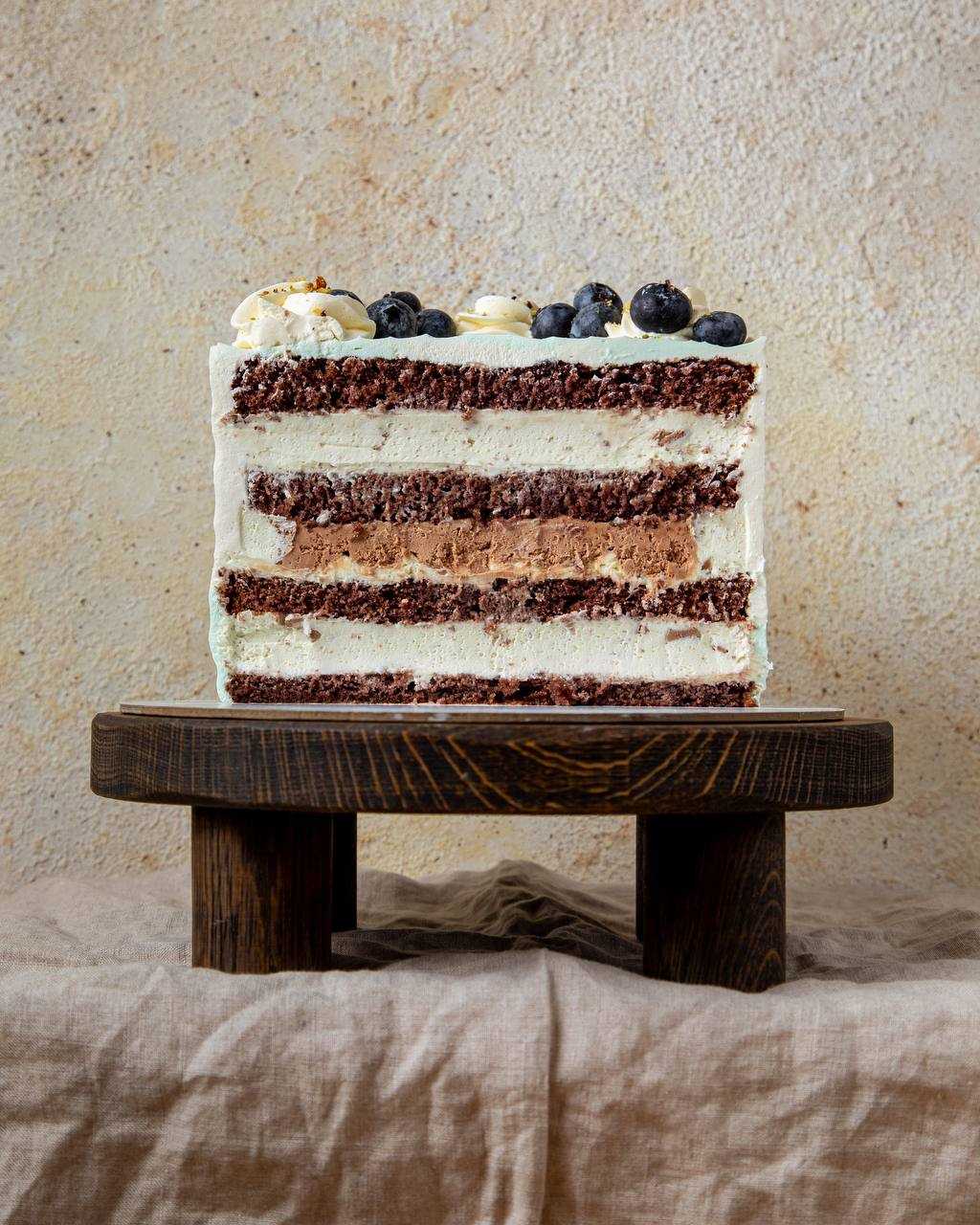 Насыщенные шоколадные коржи, шоколадный крем и сливочно-мятный крем с добавлением творожного сыра и шоколадной крошкой